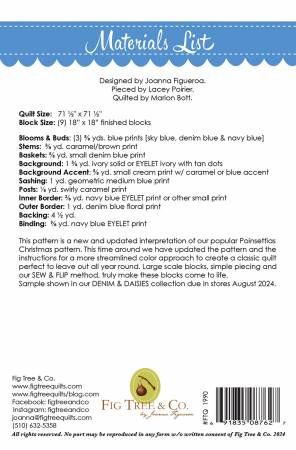 From Fig Tree Quilts By Figueroa, Joanna In Quilts Inspired by our classic Christmas pattern, Poinsettias, this new updated version focuses on our favorite tones of blue for some year round baskets. Large scale blocks paired with basic SEW & FLIP stitching, brings these baskets and blooms to life. As to the flower...well we will have to use our imagination as to what blooms come up denim color. SIZE: 71.5" x 71.5" Printed Paper Pattern Finished Size: 71-1/2in x 71-1/2in Final Product: Quilt Technique Used: Standard Machine Sewing Skill Level: Confident Beginner
