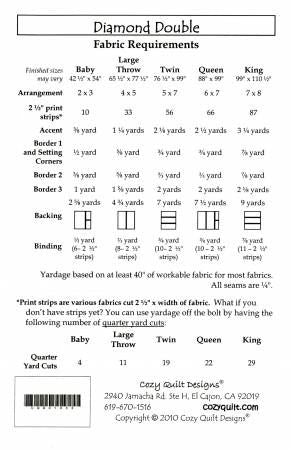 From Cozy Quilt Designs By Stout, Daniela In Quilts Diamond Double - A Strip Club Pattern Designed for 2½" Strips This wonderful pattern uses nothing but 2½" strips and borders! Diamond Double is already a bestseller. With dramatic lines and a stunning effect, the quilt is made powerful with the accent fabric (blue in our sample). And best yet… it is just one block simply twisted and turned! The pattern includes directions for: • Baby • Large Throw • Twin • Queen • King