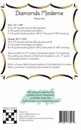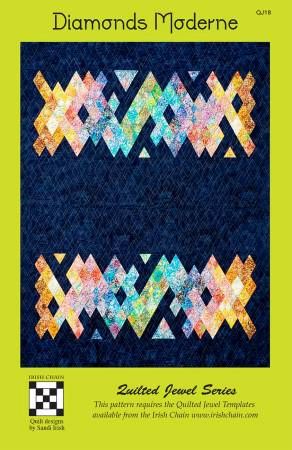 From Irish Chain By Irish, Sandi In Quilts Diamonds Moderne Comes in Twin Size (72 x 90") and Queen Size (92 x 103"). It's a simple, modern quilt design made to utilize 10" square pre-cuts. A bonus table topper pattern is included to use leftover pieces. This pattern is part of The Quilted Jewel Series and REQUIRES the Quilted Jewel Templates from the Irish Chain. Printed Paper Pattern Finished Size: 72in x 90in Final Product: Quilt Technique Used: Standard Machine Sewing Skill Level: Confident Beginner