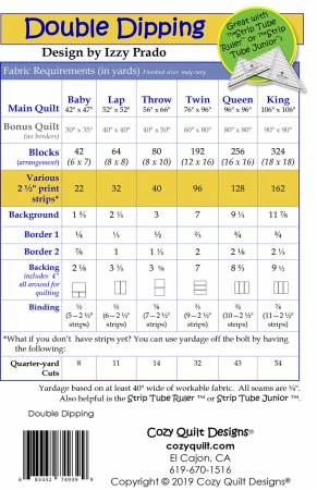 From Cozy Quilt Designs In Quilts What’s better than one quilt? Two, of course! Double Dipping, designed by Izzy Prado for 2½" strips, dips into your fabric twice to give you two different block styles for making two different quilts simultaneously. You’ll get a main quilt with borders and a smaller sized BONUS quilt without! This quilt is made even easier with our Strip Tube Ruler or Strip Tube Junior! The pattern includes full color instructions for these sizes: baby, lap, throw, twin, queen, and king.