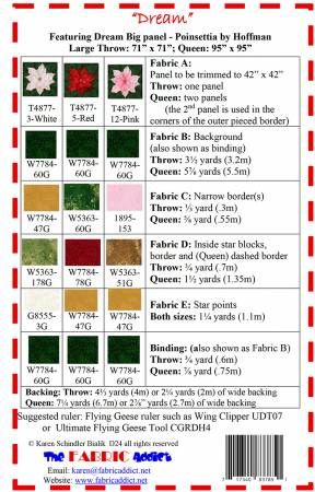 From Fabric Addict By Schindler, Karen In Quilts Dream quilt pattern. Large Throw and Queen sizes included. Panel trimmed to 42" x 42". Printed Paper Pattern Finished Size: 42in x 42in, 71in x 71in & 95in x 95in Final Product: Quilt Technique Used: Standard Machine Sewing Skill Level: Confident Beginner