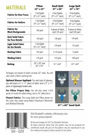 From Elizabeth Hartman By Hartman, Elizabeth In Pillows and Rugs Dwight the Deer includes instructions for making two quilt sizes and a 24” x 24” quilted pillow cover. These friendly deer blocks are made using conventional patchwork techniques. No paper piecing! The pattern also includes a complete list of the cut pieces need to make a single block, making it easy to use scraps or make single blocks for other projects. Give your blocks even more personality with an optional glasses applique.