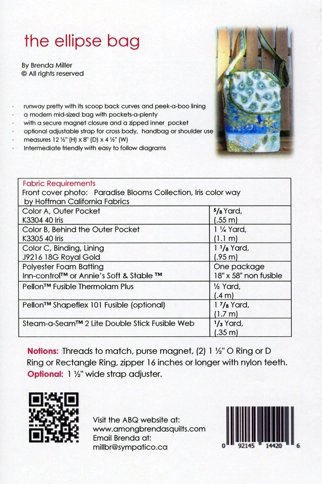 From Among Brenda's Quilts & Bags By Miller, Brenda In Bags, Purses, Totes & Electronic Covers The ellipse bag is runway ready with its graceful scoop back curves and peek-a-boo lining. This modern mid-sized bag features a secure magnetic closure. Choose from several strap lengths. The adjustable strap gives options for over the shoulder, cross-body or handbag style wear. The graceful wrap-around outer pockets offer practical storage for keys and cell phone. A fully lined interior offers a large zip top pocket and a wide patch pocket. The ellipse bag measures 12.5" (H) x 8" (W) x 4.5" (D). The adjustable strap gives up to a 18" drop or can be shortened to a comfortable 9" drop to carry as a handbag. Hardware kit available item ABQ-166-HB or ABQ-166-HN