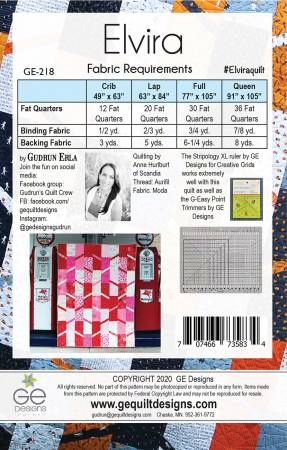 From G. E. Designs By Erla, Gudrun In Quilts Elvira is a fun and fast to make quilt from fat quarters. Construction is very easy with the Stripology XL ruler by GE Designs and the GEasy point trimmers. Instructions for using regular rulers are included. The pattern comes with 4 different size options: crib, lap, full, queen.