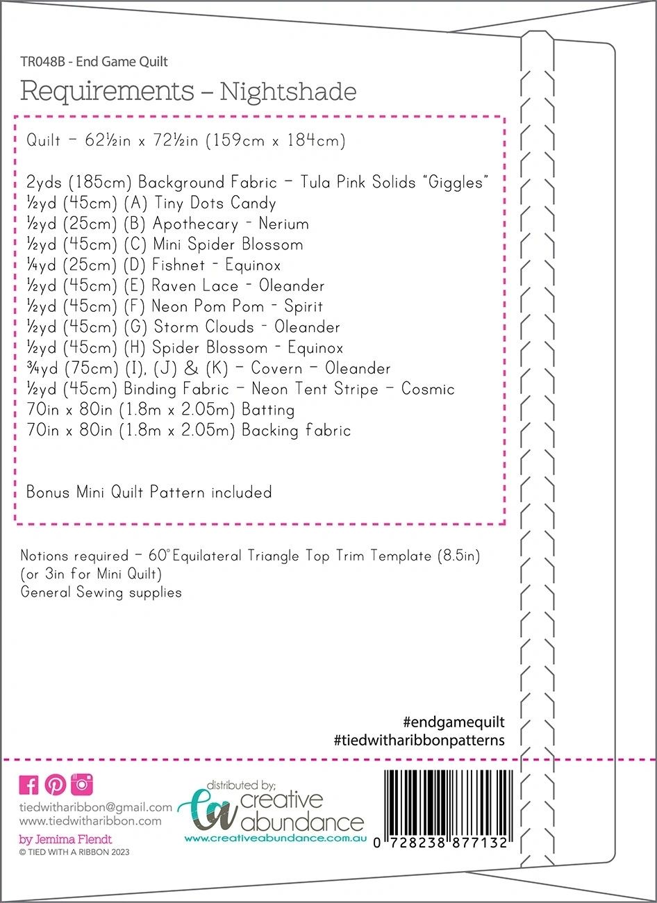 From Creative Abundance By Flendt, Jemima of Tied With A Ribbon In Quilts This listing is for the End Game pattern in the Night Shade fabrics by Tula Pink Make a Bright and Bold statement with this Triangle Quilt. For all those modern Quilt lovers then this quilt will be perfect for Solids or your favourite Prints in this geometric fun design. The Quilt pattern features both the Large Quilt size along with a fun Mini Quilt included as well. The pattern includes List of Fabric requirements Cutting Instructions Sewing Instructions Pressing Tips Layout and Assembly instructions Cutting Tags Quilt Finished Size – 62½in x 72½in (159cm x 184cm) Mini Quilt Finished Size – 20½in x 22½in (52cm x 57cm) Printed Paper Pattern Finished Size: 62-1/2in x 72-1/2in & 20-1/2in x 22-1/2in Final Product: Quilt Paper Templates Included Technique Used: Standard Machine SEwing Skill Level: Confident Beginner