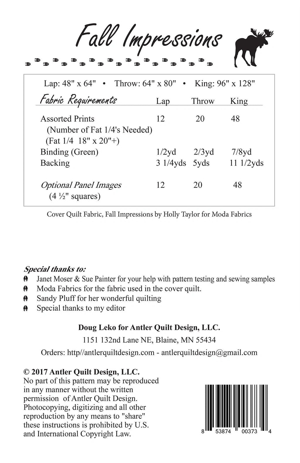 Big pieces, super fast, and fun! That's what Fall Impressions gives you. Fat quarter friendly! Lap: 48in x 64in Throw: 64in x 80in King: 96in x 128in