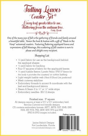 From Janine Babich Designs By Babich, Janine In Coasters and Mug Rugs One of the many joys of fall is the gathering of friends & family around a bountiful table. Honor the host & hostess with a gift of "Made in the Hoop" autumnal coasters. Featuring fluttering appliqued leaves and expressions of fall blessings, this scattering of fall coasters is sure to please. CD includes embroidery formats: ART7, ART8, DST, EMB, EXP, HUS, JEF, PCS, PES, SEW, SHV, VP3 & XXX. SVG/JPEG images and Bernina Cutwork tool designs included. Requires a 5-3/4in hoop. Finished coaster size- 5in square.