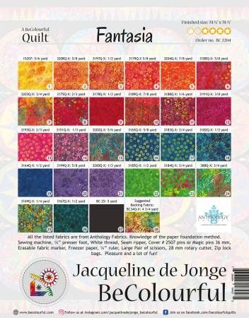 From Becolourful By Jacqueline De Jonge By Jonge, Jacqueline De In Quilts Fantasia is an explosion of colors and a pleasure to look at. The fresh and bright colors are the true BeColourful colors: sparkling and vibrant and made from the collections she designed for Anthology fabrics. This design with her 16 stars, the gorgeous in between "diamonds" and the spiked border is absolutely breathtaking and a show stopper in your store. The size is 74.5" x 74.5" Printed Paper Pattern Finished Size: 74-1/2in x 74-1/2in Final Product: Quilt Paper Templates Included Technique Used: Standard Machine Sewing / Foundation Paper Piecing Skill Level: Advanced