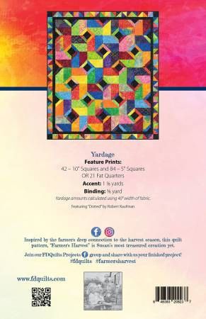 From Farmer's Daughters By Ottesen, Sarah and Travis, Susan In Quilts Farmer's Harvest is an easy pattern to kit, using either 42 - 10" squares and 84 - 5" squares or 21 Fat Quarters with additional yardage for the accent and binding. We love how the quilt showcases a collection. Quilters of all skill levels will enjoy this quick and easy pattern, using diagonal seams (aka flip corners) with a bonus half square triangle to create the border! The pattern is printed in full color with easy to follow instructions and graphics. This finished size is 63.5" x 72.5". Printed Paper Pattern Finished Size: 63-1/2in x 72-1/2in Final Product: Quilt Technique Used: Standard Machine Sewing Skill Level: Beginner