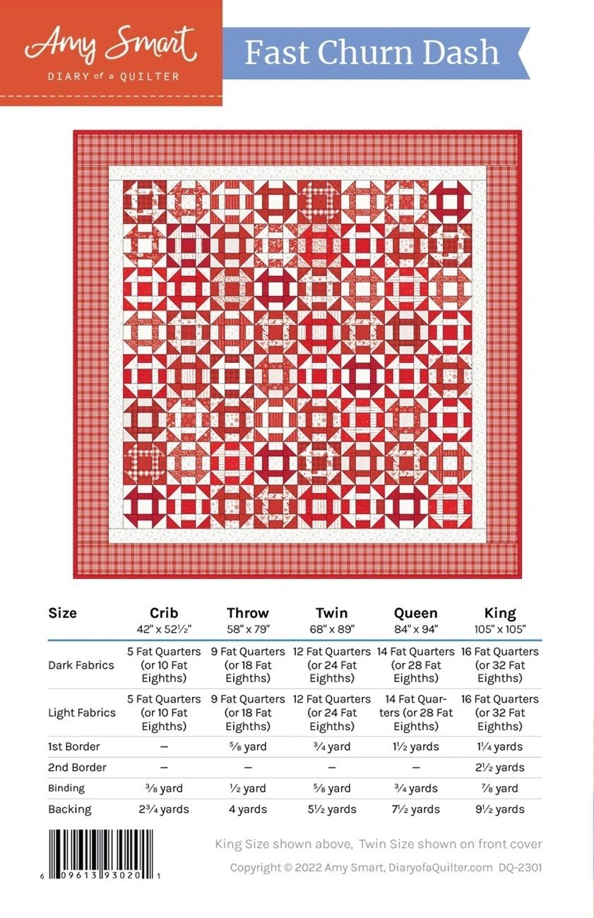 From Amy Smart - Diary of a Quilter By Smart, Amy In Quilts It is a fat quarter and fat eighth friendly quilt with instructions for multiple size quilts including: Crib - 42" x 52 1/2", Throw - 58" x 79", Twin 68" x 89", Queen 84" x 94", and King 105" x 105". The pattern is a full color, booklet style pattern. Printed Paper Pattern Finished Size: Multiple Final Product: Quilt Technique Used: Standard Machine Sewing Skill Level: Confident Beginner