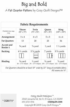 From Cozy Quilt Designs By Stout, Daniela In Quilts Big and Bold - A Fat Quarter Anonymous pattern! Show off your favorite fat quarter bundle with this fast and easy pattern. This is a great design to feature those large-scale prints you’ve been collecting, but don’t want to cut up! The pattern includes instructions for: • Throw • Twin • Queen • King