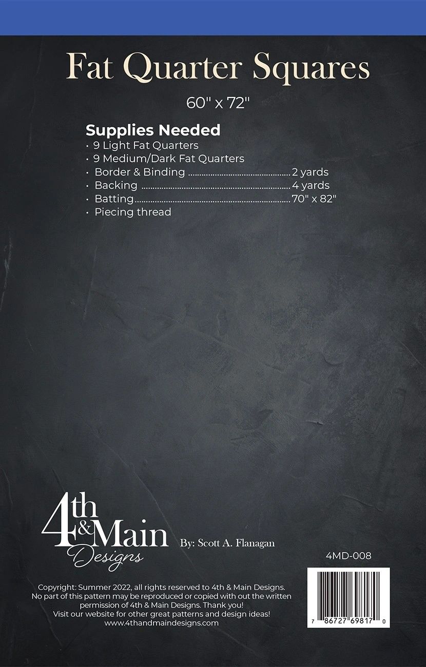 Create this simple quilt using nine sets of coordinating fat quarters. You will want a light and a dark fat quarter of each combo. Printed Paper Pattern Finished Size: 60in x 72in Final Product: Quilt Technique Used: Standard Machine Sewing Skill Level: Confident Beginner