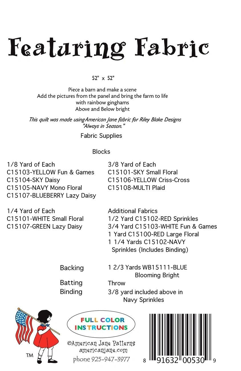 52” x 52” Featuring fabric by American Jane uses strip sets to border a large piece of fabric as a feature for the center