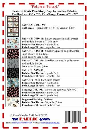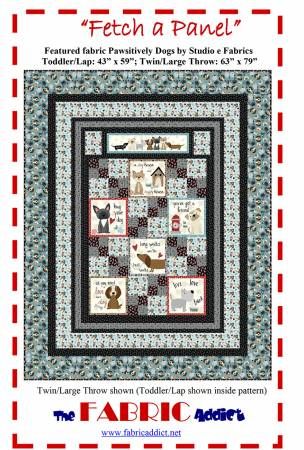 From Fabric Addict By Schindler, Karen In Quilts Fetch a Panel quilt pattern. An easy quilt pattern using 6 fussy cut 10 1/2" squares, and one fussy cut rectangle (6 1/2" x 22 1/2"). Features panel and fabric from "Paw-sitively Awesome" by Studio e Fabrics. Printed Paper Pattern Finished Size: Multiple Final Product: Quilt Technique Used: Standard Machine Sewing Skill Level: Confident Beginner