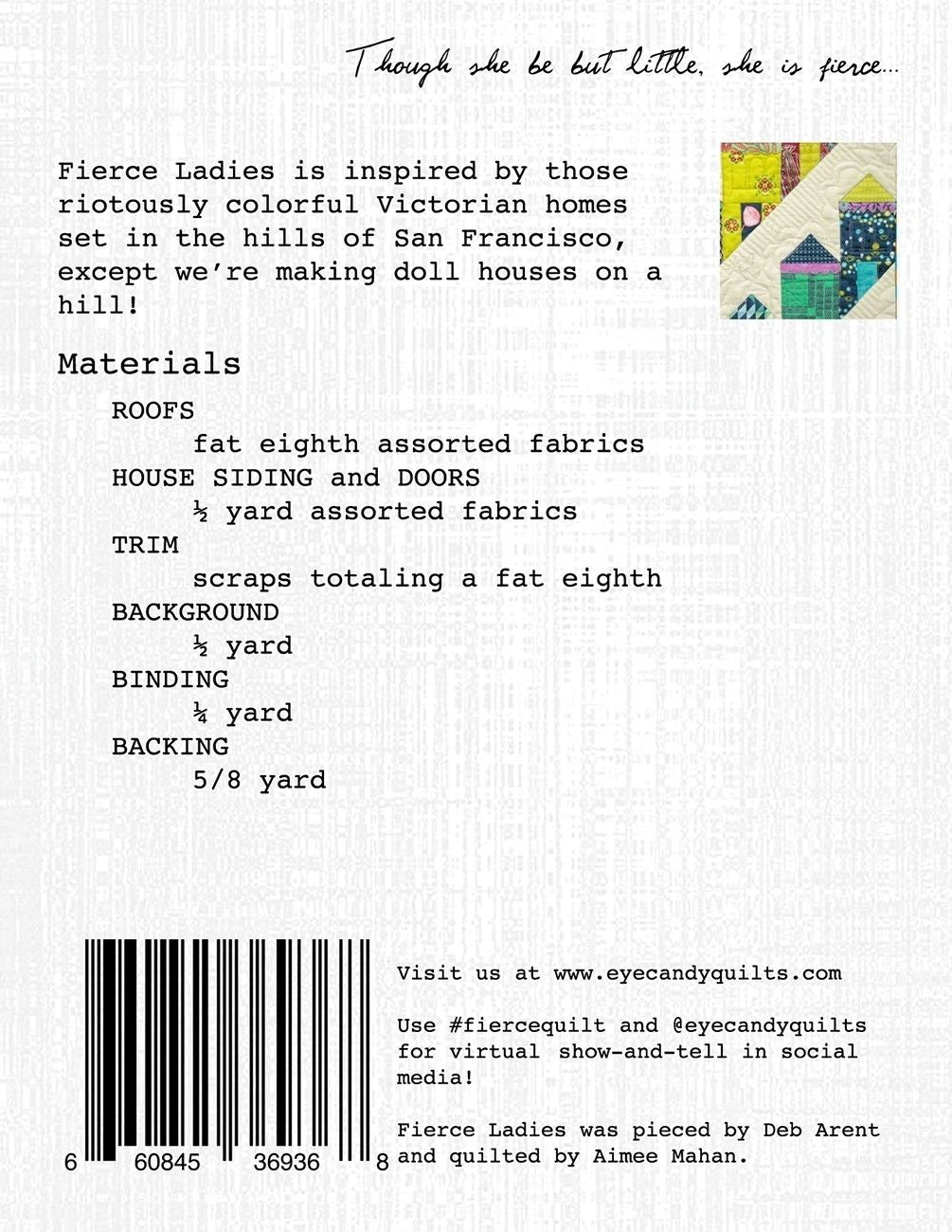 From Eye Candy Quilts In Quilts Fierce Ladies is 18in x 24in and inspired by those riotously colorful Victorian homes set in the hills of San Franciso, except we're making doll houses on a hill! The pattern is four pages plus one template page.
