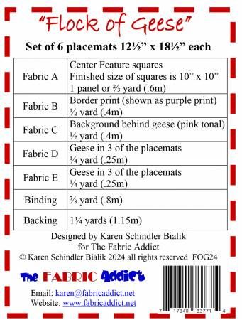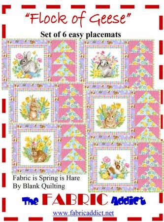 From Fabric Addict In Placemats, Table Runners & Toppers Flock of Geese placemats pattern. Set of 6. Easy to piece. Uses any panel with 10" squares, or 2/3 yard of focus fabric. Flying geese are made four at a time. Suggested ruler is Flying Geese Ruler (CGRDH4) or Wing Clipper. Featured fabric is Spring is Hare by Blank Quilting. Printed Paper Pattern Finished Size: 12-1/2in x 18-1/2in Final Product: Placemat / Table Runner / Table Topper Technique Used: Standard Machine Sewing Skill Level: Confident Beginner