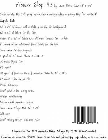 From Fiberworks Inc By Heine, Laura In Quilts Flower Shop #3 Collage Pattern by Laura Heine. This pattern is collage mixed with Derwent Inktense pencils. Bring this collage to life with accentuating the flowers with blending and shading of the Inktense pencils. This pattern includes full size color step by step instructions. Finished size 11x14. Printed Paper Pattern Finished Size: 11in x 14in Final Product: Wall Hanging Paper Templates Included Technique Used: Standard Machine Sewing Skill Level: Beginner