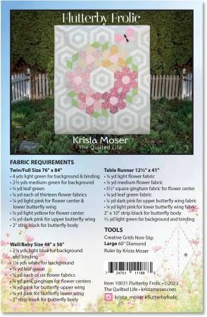 From Krista Moser, The Quilted Life By Moser, Krista In Quilts Up your quilting game with this charming pattern! Flutterby Frolic will give you a complicated look without tedious piecing. Gain confidence with angles and color placement. This quilt is constructed of four main blocks: the flowers, the butterflies, the leaf blocks, and the background hexagons. Each one utilizes a different technique that will be a valuable addition to your quilting skills library. Use varying shades of fabric for an ombre look, or use scraps from your stash for an eclectic look! This pattern comes with three size layouts: twin/full, wall/baby, and a table runner. Printed Paper Pattern Finished Size: 76in x 84in, 48in x 56in, & 12-1/2in x 41in Final Product: Quilt Technique Used: Standard Machine Sewing Skill Level: Intermediate