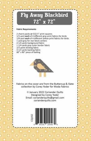 From Coriander Quilts By Yoder, Corey In Quilts Fly Away Blackbird is an intermediate level charm pack quilt that finishes at 72" x 72". This is a full color booklet type pattern. Printed Paper Pattern Finished Size: 72in x 72in Final Product: Quilt Technique Used: Standard Machine Sewing Skill Level: Intermediate