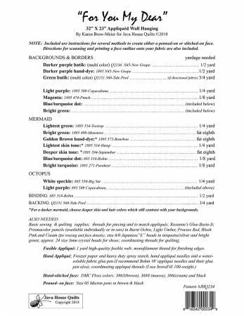 From Java House Quilts By Brow, Karen WRAPUPSALE_2024 Collection In Quilts A quicker fusible technique or traditional applique methods create this elegant 32in x 23in mermaid quilt, perfect for a young girl’s room or any place you’d like too add beauty and color. Print a face template onto your fabric with your at-home printer, or simply trace the pattern onto your skin fabric. Enhance and finish the face with micron pens or DMC floss hand stitches. Beads and stem-stitching add just enough detail and tips for beautiful hands and quilting are included. Model made with Hoffman California hand-dyes and batiks