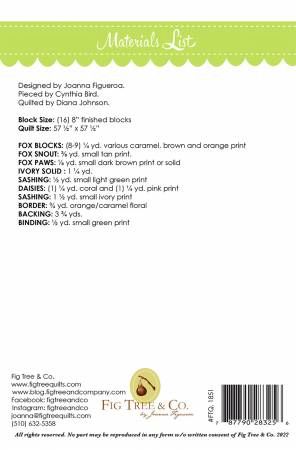 From Fig Tree Quilts By Figueroa, Joanna In Quilts Originally designed as a block for our AUTUMN FROLIC Block of the Month program, Francesca the fox was begging to be made into a quilt all her own. We picked some daisies to go along with her and could not resist the charming result. Choose your favorite set of caramel and orange prints to grow your own “den” of foxes. Simple piecing is all it takes for this quilt and I love that it feels like it is more complicated than it really is! Size 57.5 x 57.5