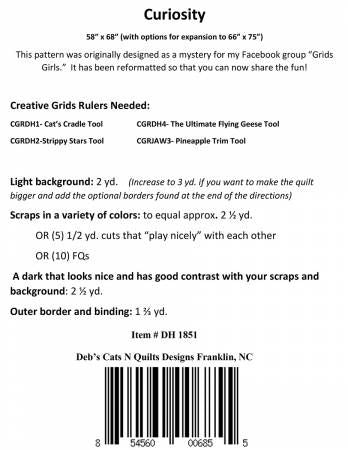 From Deb's Cats N Quilts By Heatherly, Deb In Quilts Curiosity finishes 58in x 68in and is a great pattern to use at your next retreat, mystery weekend, or in a series of Creative Grids® ruler classes. The pattern is divided into 8 steps and printed so that each step can be passed out individually. Curiosity uses the CGRDH1 Cat’s Cradle Tool, the CGRDH2-Strippy Stars Tool, the CGRDH4-Ultimate Flying Geese Tool, and the CGRJAW3-Pineapple Trim Tool. Instructions are included for two optional pieced borders that will enlarge the quilt to 66in x 75in.