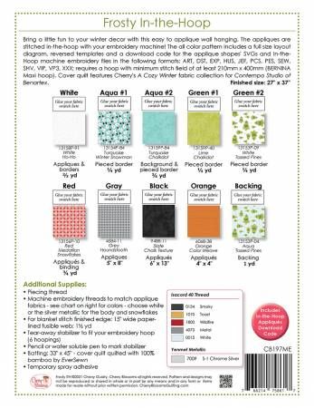 From Cherry Blossoms By Guidry, Cherry In Quilts Bring a little fun to your winter decor with this easy to applique wall hanging. The appliques are stitched in-the-hoop with your embroidery machine! The all color pattern includes a full size layout diagram, reversed templates and a download code for the applique shapes' SVGs and In-the-Hoop machine embroidery files in the following formats: ART, DST, EXP, HUS, PCS, PES, SEW, SHV, VIP, VP3, XXX; requires a hoop with minimum stitch field of at least 210mm x 400mm (BERNINA Maxi hoop). Cover quilt features Cherry's A Cozy Winter fabric collection for Contempo Studio of Benartex. Printed Paper Pattern Finished Size: 27in x 37in Final Product: Wall Hanging Paper Templates Included Technique Used: Applique & Machine Embroidery Skill Level: Confident Beginner