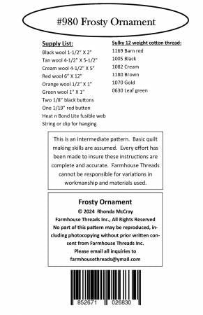 From Farmhouse Threads Inc By McCray, Rhonda In Craft Wool applique and hand embroidery 5" ornament Printed Paper Pattern Finished Size: 5in Final Product: Craft / Ornament Paper Templates Included Technique Used: Applique / Hand Embroidery / Stitchery Skill Level: Beginner