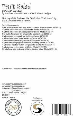 From Coach House Designs By Cherniwchan, Barbara In Quilts Lap quilt featuring apples, lemons, cherries, pomelos, flowers and courthouse steps. Bright and fun and uses Fruit Loop by Basic Grey but would look great in any fun fabric. Printed Paper Pattern Finished Size: 58in x 66in Final Product: Quilt Technique Used: Standard Machine Sewing Skill Level: Confident Beginner