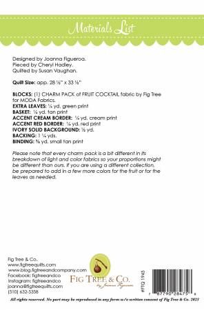 From Fig Tree Quilts By Figueroa, Joanna In Quilts Creating a quilt with not much more than a single charm pack has become a personal quilt challenge for me several times a year, often when we release a new LITTLE BOX OF FIGS project. This time, all I Could see was a tower of fruit a-la Carmen Miranda and the infamous fruit hat! This is a fun and simple wall hanging or table topper that took us a single day to complete….I hope you enjoy it as much as we have! Printed Paper Pattern Finished Size: 28-1/2in x 33-1/2in Final Product: Quilt Technique Used: Standard Machine Sewing Skill Level: Confident Beginner