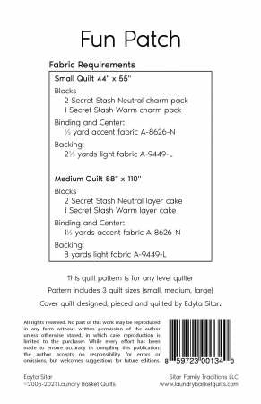 From Laundry Basket Quilts By Sitar, Edyta In Quilts Pieced Quilt Pattern 3 quilt sizes included: 44v x 55in, 80in x 110in, and 110in x 110in Printed Paper Pattern Final Product: Quilt Finished Size: 44in x 55in Technique: Standard Machine Sewing Skill Level: Any Level