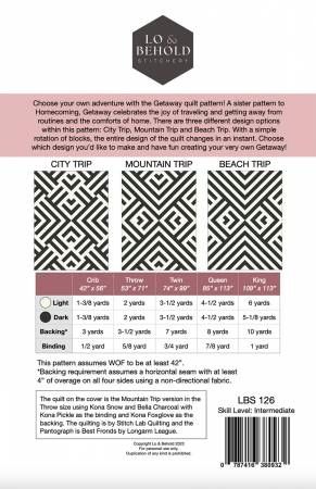 From Lo & Behold Stitchery By Lloyd, Brittany In Quilts Choose an adventure with the Getaway quilt pattern! A sister pattern to Homecoming, Getaway celebrates the joy of traveling and getting away from routines and the comforts of home. There are three different design options within this pattern: City Trip, Mountain Trip and Beach Trip. With a simple rotation of blocks, the entire design of the quilt changes in an instant. Choose which design you’d like to make and have fun creating your very own Getaway! Choose from five different sizes ranging from Crib to King. This pattern includes 3 design options, helpful diagrams, thorough instructions, alternate color-way and quilting ideas, and a coloring page to plan your quilt. 5 sizes: Crib (42" x 56"), Throw (53" x 71"), Twin (74" x 99"), Queen (85” x 113") and King (109" x 113"). Printed Paper Pattern Finished Size: Multiple Final Product: Quilt Technique Used: Standard Machine Sewing Skill Level: Intermediate