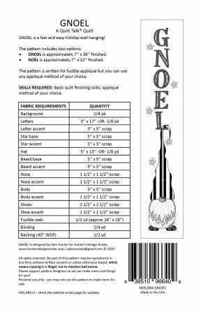 From Hunter's Design Studio By Hunter, Sam In Quilts GNOEL is a fast and easy holiday wall hanging! The pattern includes two options: GNOEL is approximately 7’’ x 36’’ finished. NOEL is approximately 7’’ x 32’’ finished. The pattern is written for fusible appliqué but you can use any appliqué method of your choice.