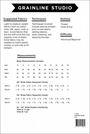 From Grainline Studio LLC By Beeman, Jennifer In Wearables The Hadley is drapey, fluid, and sophisticated. It is the semi-formal top that you need to wear to work or to throw on over your jeans for a night out. View A has a jewel neck, a pleat at the back neckline, and bracelet length sleeves. View B is sleeveless and features a soft V-neck. Both are subtly geometric as they have center seams in front and back as well as a wide hem.