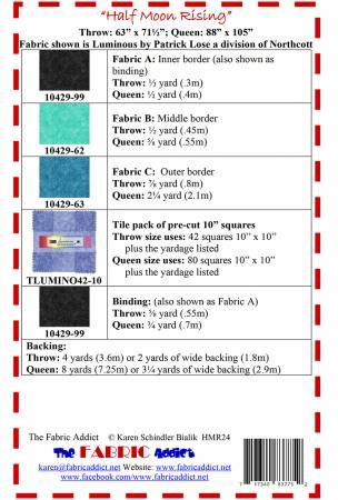 From Fabric Addict By Schindler, Karen In Quilts Half Moon Rising quilt pattern. Throw and Queen sizes. Pattern uses 10" precut packs: Throw uses 42 squares, Queen uses 80 squares. Template provided or use any circle cutter such as Creative Grids Circle Savvy Ruler. Printed Paper Pattern Finished Size: 63in x 71-1/2in & 88in x 105in Final Product: Quilt Paper Templates Included Technique Used: Standard Machine Sewing Skill Level: Confident Beginner