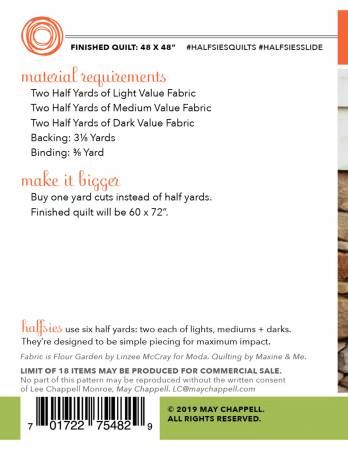 From May Chappell By Monroe, Lee Chappell In Quilts Halfsies use six half yards: two each of lights, mediums + darks. They’re designed to be simple piecing for maximum impact. Finished size is: 48x48". Larger bonus size included uses six full yards. Printed Paper Pattern Finished Size: 48in x 48in Final Product: Quilt Technique Used: Standard Machine Sewing Skill Level: Confident Beginner