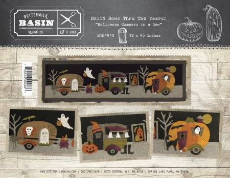 From Buttermilk Basin By West, Stacy In Placemats, Table Runners & Toppers Halloween Campers In A Row is a fun wool runner that measures 12in x 43in . The vintage campers look fabulous decked out for Halloween!