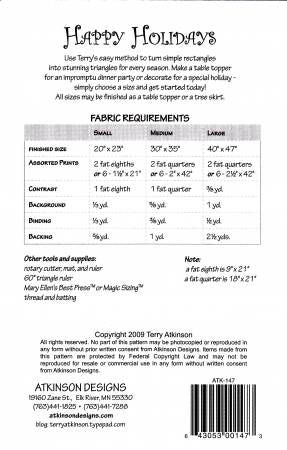 Tree skirt and table topper in three sizes. Use Terry's easy method to turn simple rectangles into stunning triangles for every holiday! 23", 35", 47". Great to use for a Fall, Halloween, Thanksgiving or Christmas project.