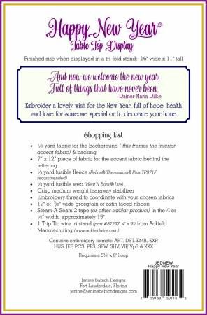 From Janine Babich Designs By Babich, Janine In Placemats, Table Runners & Toppers And now we welcome the new year, full of things that have never been.' Embroider a lovely 'Made in the Hoop' wish for the New Year, full of hope, health and love for someone special or to decorate your home. Download key accessible design includes embroidery formats: ART, DST, EMB, EXP, HUS, JEF, PCS, PES, SEW, SHV, VIP, VP3 & XXX. Requires a 5 3/4 in. x 8in. hoop, finished size when displayed in the tri-fold stand: 16in. wide x 11in in height. Digital Download Code for Machine Embroidery Finished Size: 16in x 11in Final Product: Placemats Table Toppers Table Runners Technique Used: Machine Embroidery Skill Level: Beginner