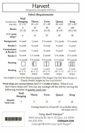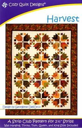 From Cozy Quilt Designs By Dell'Orco, Georgette In Quilts Harvest - A Strip Club Pattern Designed for 2½” Strips! This wonderful pattern uses nothing but 2½" strips and borders! While the name Harvest brings to mind rust and brown colors, this design looks good in any fabric! Striking and bold, Harvest is one of those patterns that gives 2 ½" strips a sophisticated feel and makes a fantastic quilt. The pattern includes directions for Wall Hanging, Throw, Twin, Queen and King sizes. The pattern includes instructions for: • Wall Hanging • Throw • Twin • Queen • King
