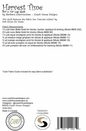 From Coach House Designs By Cherniwchan, Barbara In Quilts 55" x 75" fall lap quilt featuring Deb Strain's Harvest Wishes fabric line. Design includes pieced pumpkins, leaves and birds with applique leaves and tendrils on pumpkins. Printed Paper 55in x 75in Final Product: Quilt Paper Templates Included Technique Used: Applique Skill Level: Confident Beginner