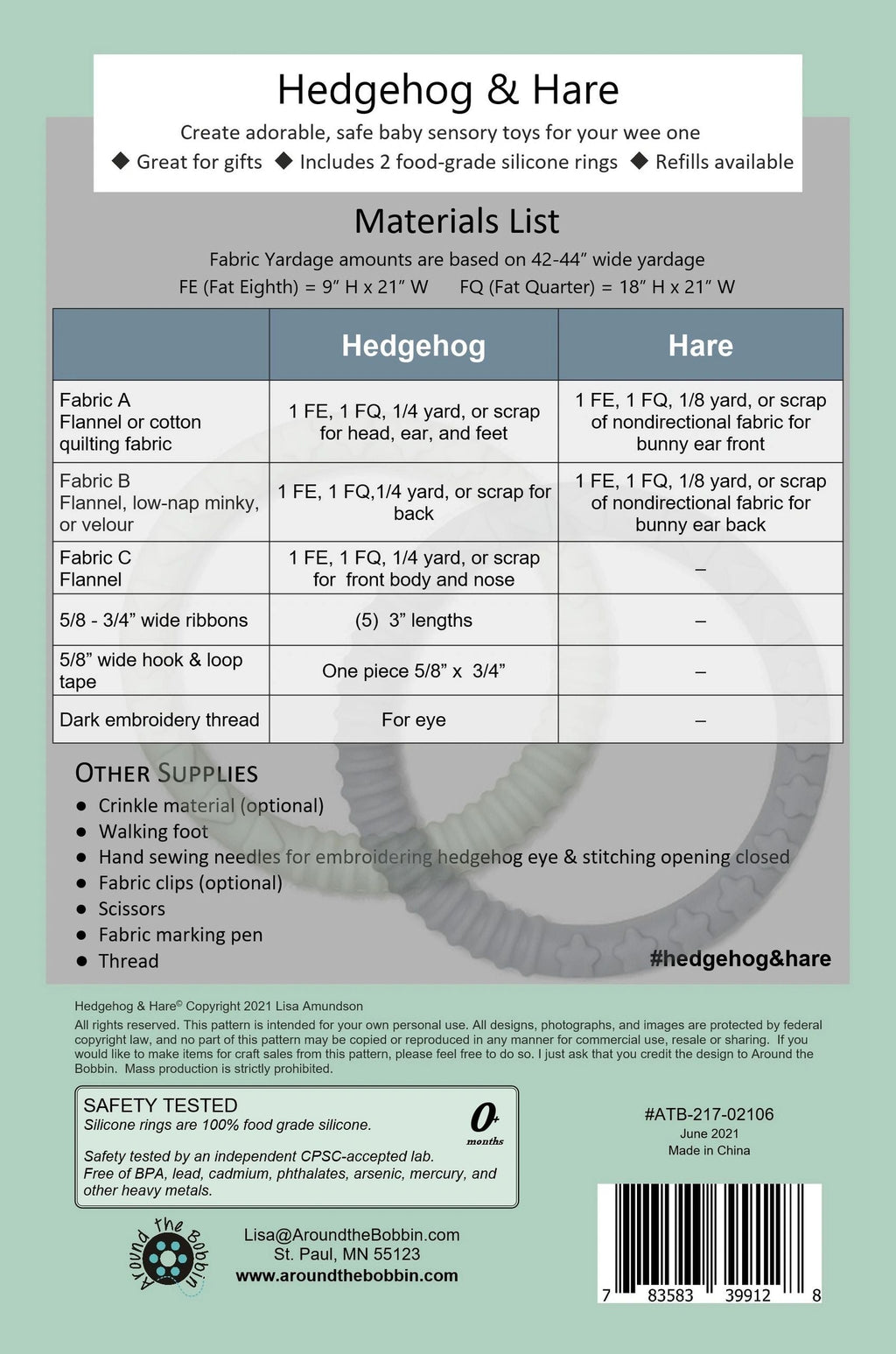 From Around the Bobbin By Amundson, Lisa In Craft Make adorable baby sensory toys to give as gifts. Easy for baby to hold and explore the textures of the silicone, fabric, ribbons and optional crinkle material. Silicone is safe for babies to chew, tug, squeeze and shake. Includes 2 silicone rings. Dishwasher safe. Silicone rings are made from 100% baby-safe food grade silicone (safety-tested to be free of BPA, phthalates and harmful metals). Printed Paper Pattern Final Product: Toy / Dolls Technique: Standard Machine Sewing Templates included: Yes - Paper Templates Skill Level: Confident Beginner