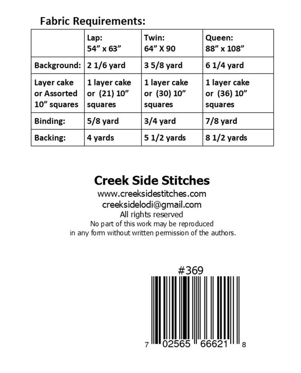 From Creek Side Stitches By Hellenbrand, Patrica T In Quilts Quilt Creatively Cut Using Assorted 10in Square In Three Sizes Printed Paper Pattern Finished Size: 54in x 63in, 64in x 90 & 88in x 108in Final Product: Quilt Technique Used: Standard Machine Sewing Skill Level: Intermediate