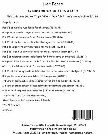 From Fiberworks Inc By Heine, Laura In Quilts Her Boots Collage Pattern by Laura Heine. This beautiful collage is used with Laura Heine's new fabric line for Windham Fabrics "Yippie Yi Yo ki Yay" will be available January 2023. This pattern includes step by step collage instruction with colored photos and full size pattern. Finish size 33x38. Printed Paper Pattern Finished Size: 33in x 38in Final Product: Wall Hanging Paper Templates Included Technique Used: Standard Machine Sewing Skill Level: Beginner