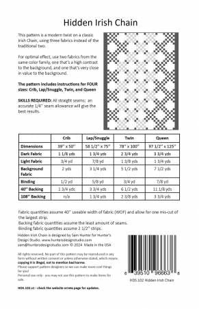 From Hunter's Design Studio By Hunter, Sam In Quilts This pattern is a modern twist on an Irish Chain, using 3 fabrics instead of two. Pattern includes instructions for FOUR sizes: crib, lap/snuggle, twin, queen. Printed Paper Pattern Finished Size: 39in x 50in, 58in x 75in, 78in x 100in & 97in x 125in Final Product: Quilt Technique Used: Standard Machine Sewing Skill Level: Confident Beginner