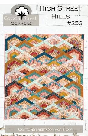From Cotton Street Commons By Owen, Marcea In Quilts High Street Hills is a beautiful Modern Scrappy Quilt. The triangle are made with strips and then cut with a 60 degree template or ruler. It uses 24 fat quarters which makes it great for kitting. The quilt is 62" x 68" and looks great in prints or solids. Printed Paper Pattern Finished Size: 62in x 68in Final Product: Quilt Paper Templates Included Technique Used: Standard Machine Sewing Skill Level: Confident Beginner