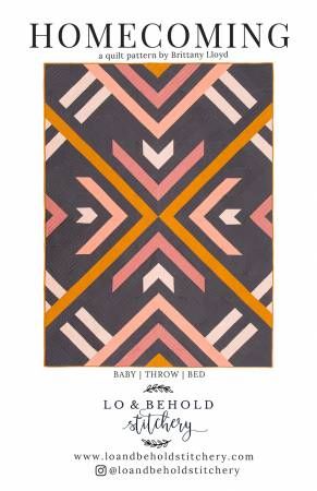 From Lo & Behold Stitchery By Lloyd, Brittany In Quilts Homecoming is a design that symbolizes warmth, comfort and a sense of belonging. It is traditionally pieced and includes helpful diagrams, thorough cutting instructions, alternate color-way ideas and more. -3 sizes: Baby (32" x 42"), Throw (53" x 71"), Bed (74" x 99") -Skill Level: Intermediate