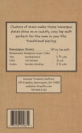 From Kansas Troubles Quilters By Hagmeier, Lynne In Quilts Homespun Stars (74in Sq. Lap Quilt) - Layer Cake Friendly - cluster of stars make these homespun plaids shine on a cuddly, cozy lap quilt perfect for the man in your life. Printed Paper Pattern Final Product: Quilt Finished Size: 74in x 74in Technique: Standard Machine Sewing Skill Level: Confident Beginner