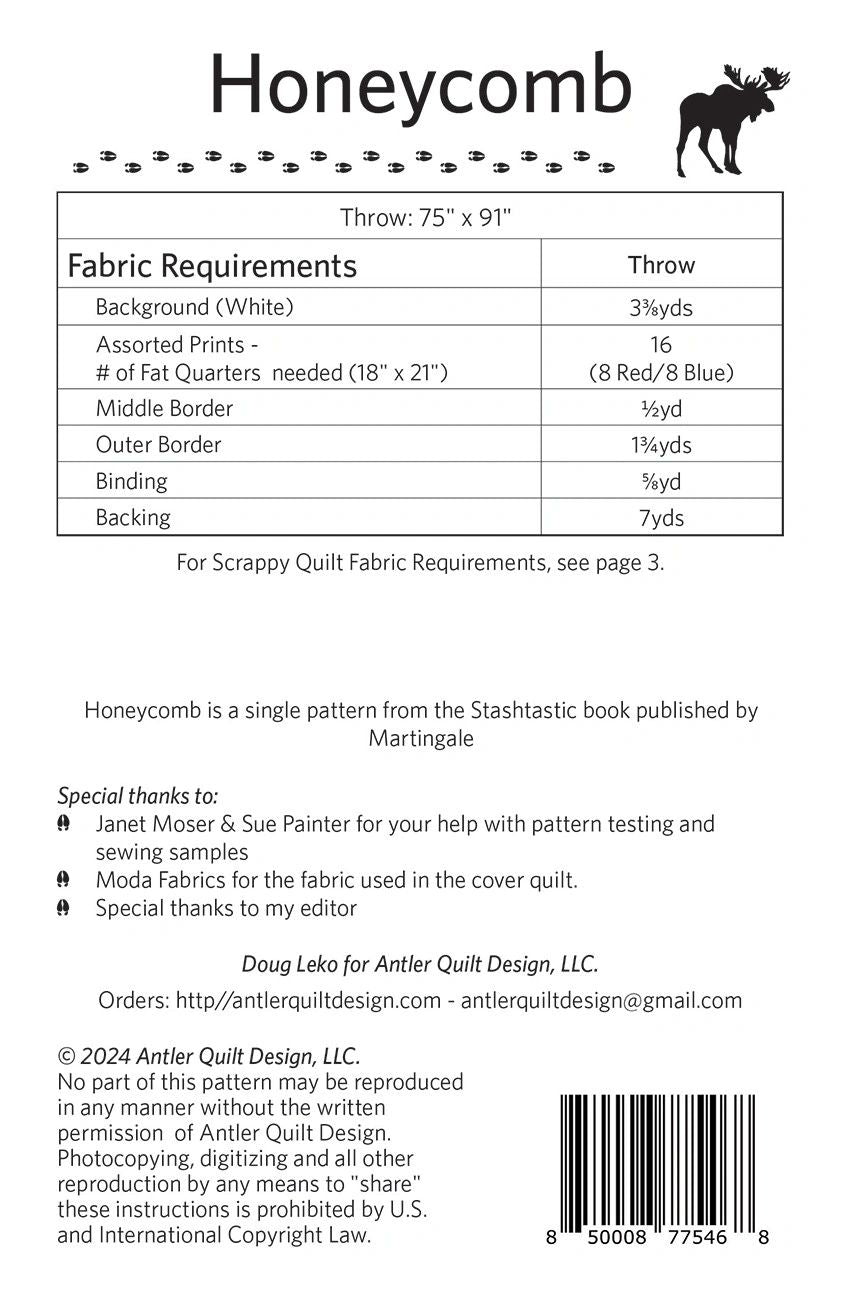 Honeycomb is now available in a single pattern format! From the best selling book Stashtastic! formerly published by Martingale. Printed Paper Pattern Finished Size: 75in x 94in Final Product: Quilt Technique Used: Standard Machine Sewing Skill Level: Beginner