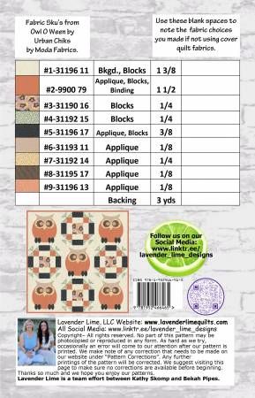 From Lavender Lime Quilting In Quilting - General A little quilt applique goes a long way on this adorable and sweet design using Moda Fabric's Owloween by Urban Chick. Small quilt at 37 1/2'' x 37 1/2''. Great tabletopper or quilt wall hanging. Softcover
